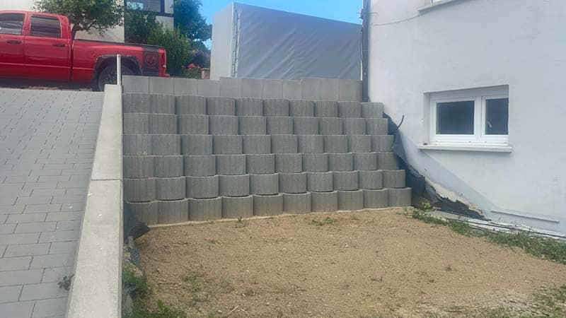 - 🧱 Betonblockmauer in modularer Ausführung – ideal für schnelles, stabiles Abfangen von Höhenunterschieden