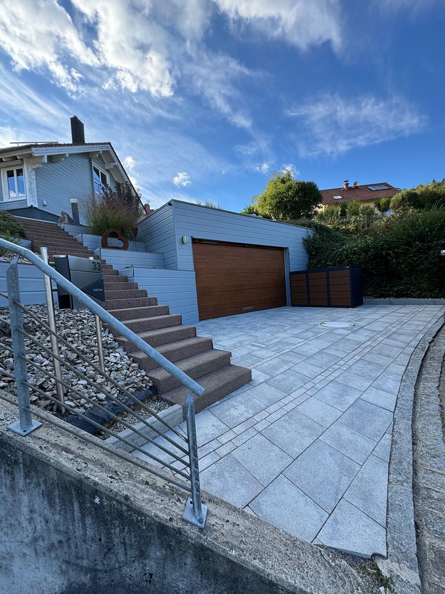 Bei diesem Projekt wurde eine bestehende Garageneinfahrt in Laufenburg komplett neu gepflastert. Ziel war es, die Fläche sowohl optisch aufzuwerten als auch funktional für tägliche PKW-Belastungen auszulegen.