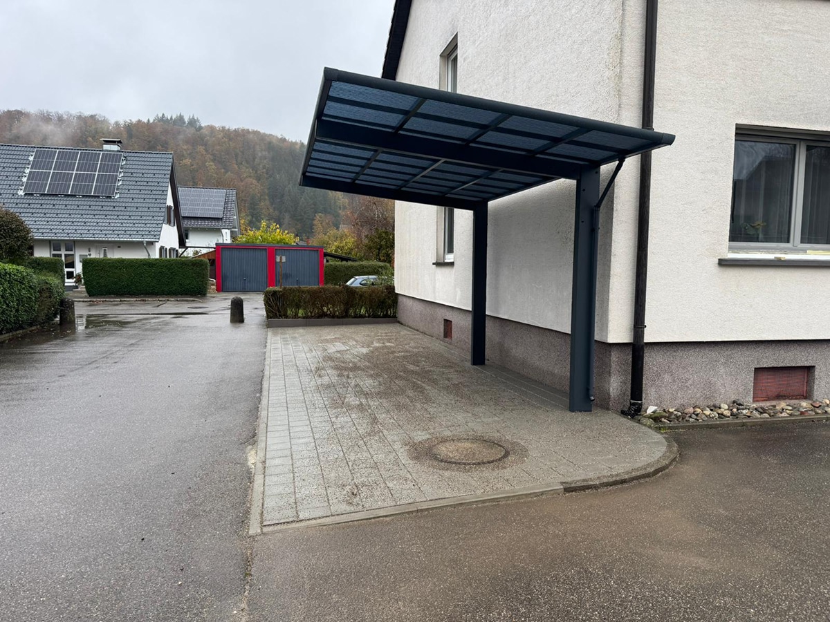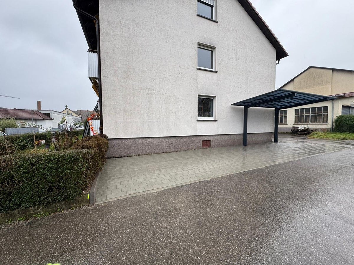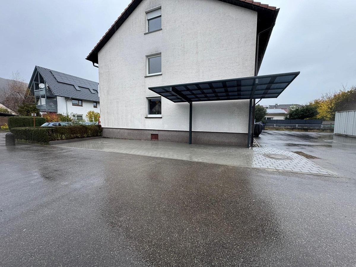 Im Rahmen dieses Projekts wurde direkt neben einem Wohnhaus eine neue Parkfläche angelegt und professionell gepflastert. Um das Fahrzeug dauerhaft vor Witterung zu schützen, wurde zusätzlich ein stabiles Carport-Dach montiert.